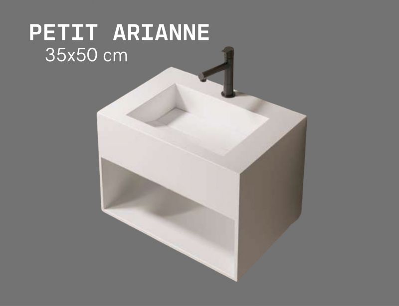 Das PETIT ARIANNE Waschbecken ist ein kompakter Handwaschtisch aus Solid Surface mit einer glatten, matten weißen Oberfläche. Hergestellt aus zwei Dritteln natürlichen Mineralien und widerstandsfähigem Harz, bietet es eine porenfreie, antibakterielle Oberfläche, die sehr langlebig und pflegeleicht ist.
