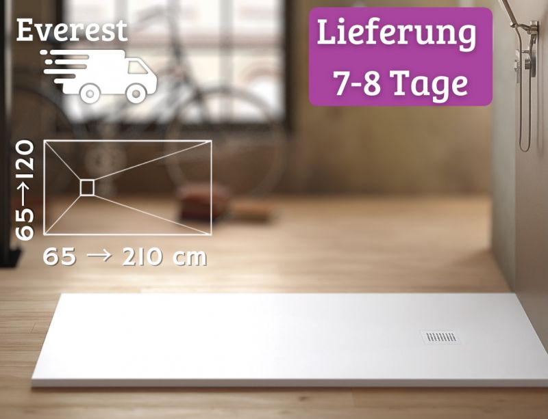 Die EVEREST-Duschwannen werden aus ökologischer und langlebiger Acrystone®-Resin gefertigt. Sie sind maßgefertigt oder zuschneidbar erhältlich.