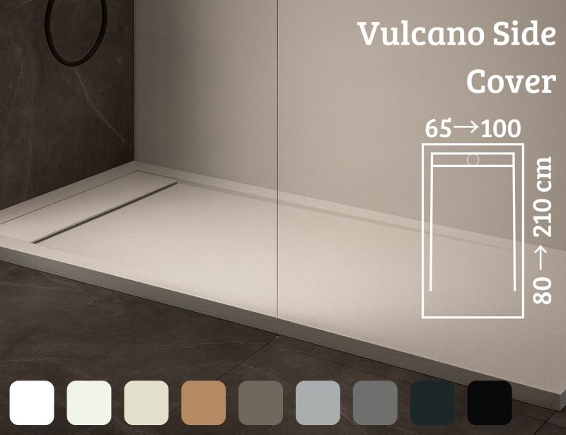 Die Duschwannen, Rinnen VULCANO SIDE INOX, bestehen aus ökologischem und langlebigem Acrystone®-Harz. Sie können nach Maß gefertigt oder nachgeschnitten werden.