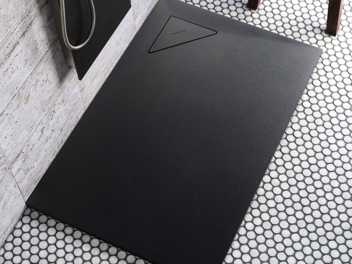 Design-Duschwanne, mit Eckwasserablauf, Siphon in der linken Ecke bei 17 x 17 cm, Schieferoptik, rutschfest.