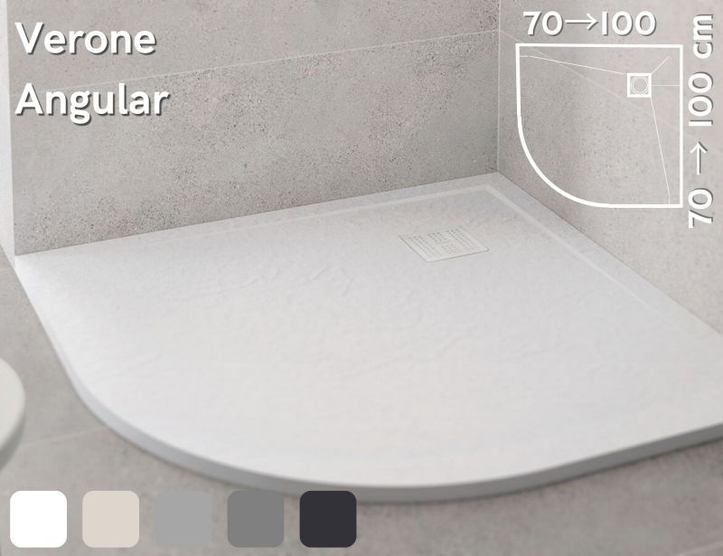 Entdecken Sie die Viertelkreis-Duschwanne VERONE ANGULAR 80x80cm, extra-flach (2,5 cm dick), aus Mineralharz, Schieferoptik und rutschfest. Maßanfertigung möglich mit 8 verfügbaren Farben. Kostenlose Lieferung.