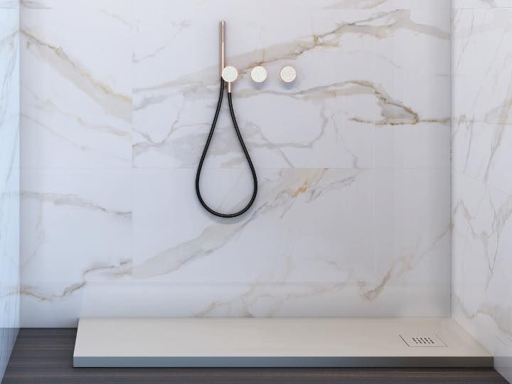 Die Duschwanne ist schuldig, bis zu 20 cm. Ein flacher Bereich am Ende der Duschwanne ermöglicht diese Reduzierung, ohne die Abflussneigungen zu beschädigen.