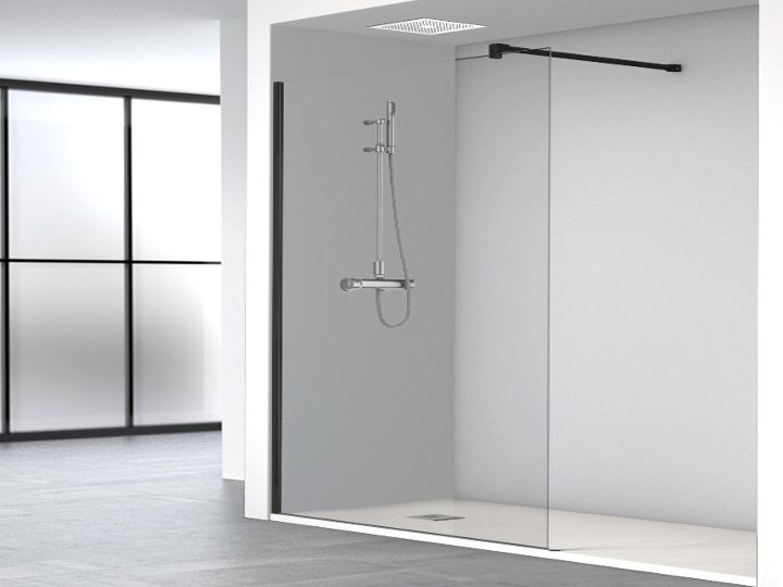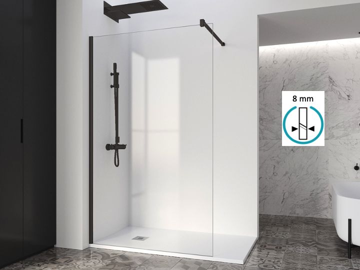 Feste Duschwand aus 8 mm Sicherheitsglas, mit Anti-Kalk-Behandlung, reversibel.