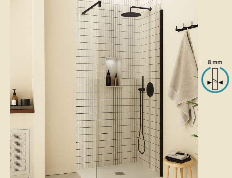 Feste Duschwand aus 8 mm Sicherheitsglas, mit Anti-Kalk-Behandlung, reversibel.