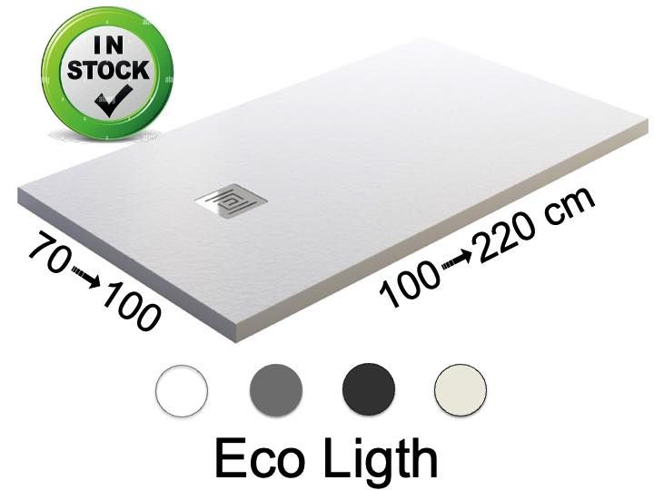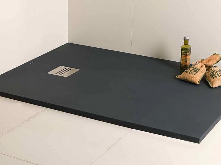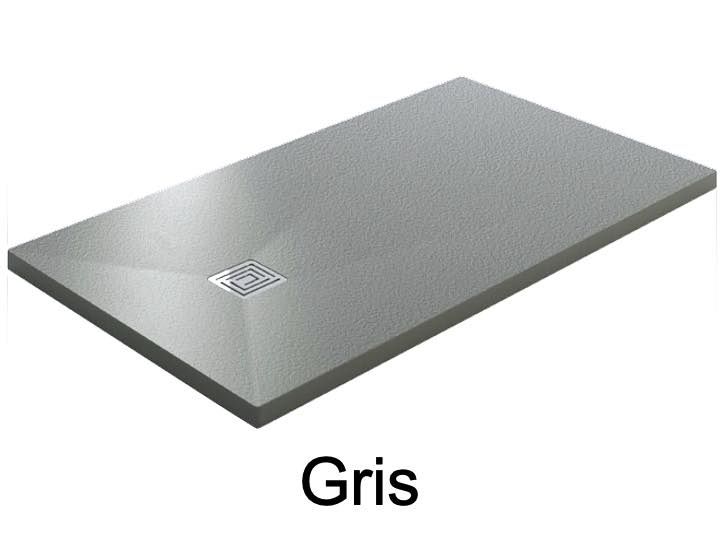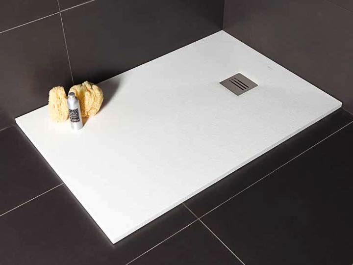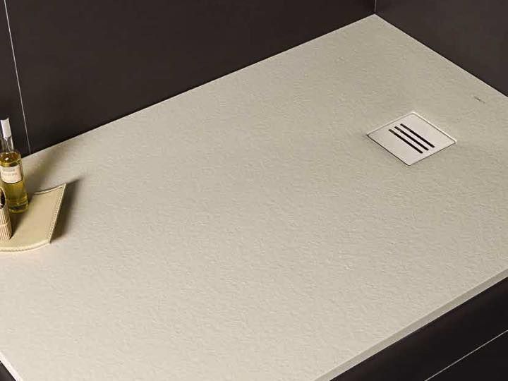 Extraflache Duschwannen werden aus einem mit mineralischem Füllstoff angereicherten Harz hergestellt und mit einem sanitären Gelcoat überzogen. Diese Zusammensetzung verbessert ihre Widerstandsfähigkeit und verringert gleichzeitig ihr Gewicht erheblich. Die strukturierte Oberfläche mit Schiefer-Effekt ist als rutschfest zertifiziert (Klasse 3, PN24). Der Gelcoat bietet einen wirksamen Schutz gegen Kratzer, Pilze und Schimmel. Diese Duschtassen sind für eine maßgeschneiderte Installation zuschneidbar.